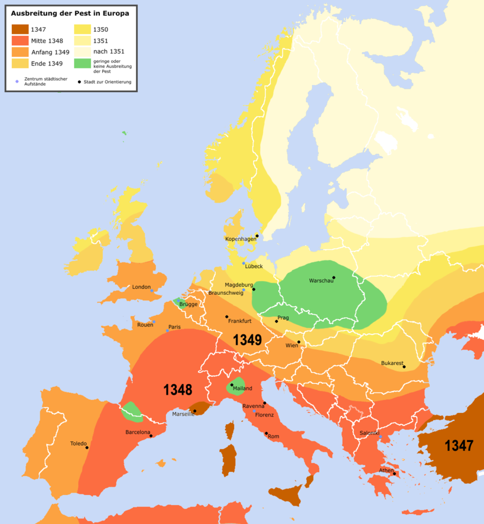 ¿Ya el nombre por sí solo suena bastante mal verdad? Puede que ya hayas escuchado hablar de ella, una pandemia que asoló todo un continente. Se cree que tuvo su origen en la región asiática y que a través de las rutas comerciales llegó al continente europeo donde paso a ser responsable de millones de vidas perdidas, no existen datos muy exactos de la época pero se estima que murieron entre 75 y 200 millones de personas, una cifra bastante alta, y aún más cuando lo vemos de forma porcentual, representando entre el 30 y 60% de la población europea.